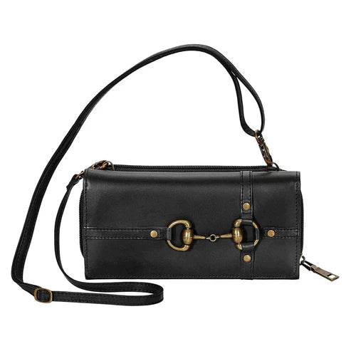 Experience versatility and style with the AWST Int'l Snaffle Bit Leather Cross Body Wallet. Crafted from genuine leather, this sophisticated 3-fold design features an equestrian snaffle bit embellishment and a secure magnetic top flap closure. Inside, it offers 12 credit card slots, bill fold slide pockets, and a clear window for your license. Easily transform it from a wallet to a clutch using the convenient 6” wrist band or attach the removable, adjustable crossbody strap for hands-free use up to 56” long. The gusseted back zip pocket keeps coins or your phone accessible and secure. Dimensions: 6.75”W x 3.75”H x 2.25”D.