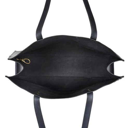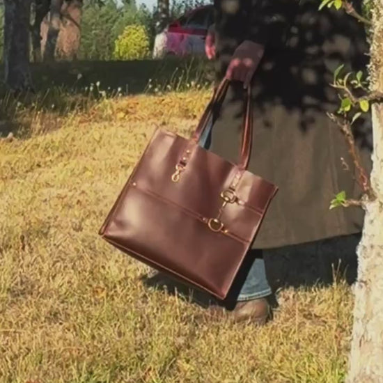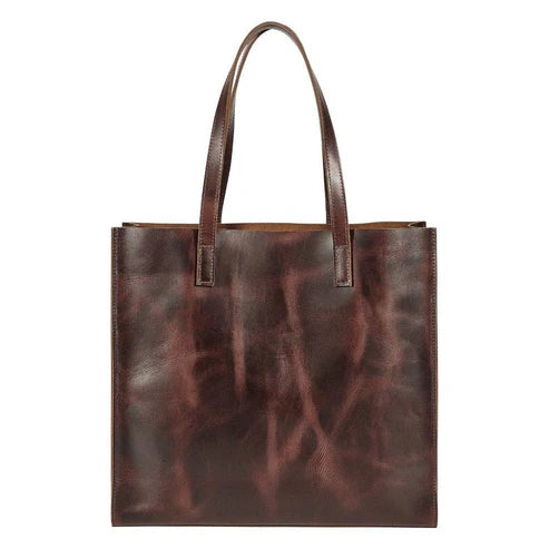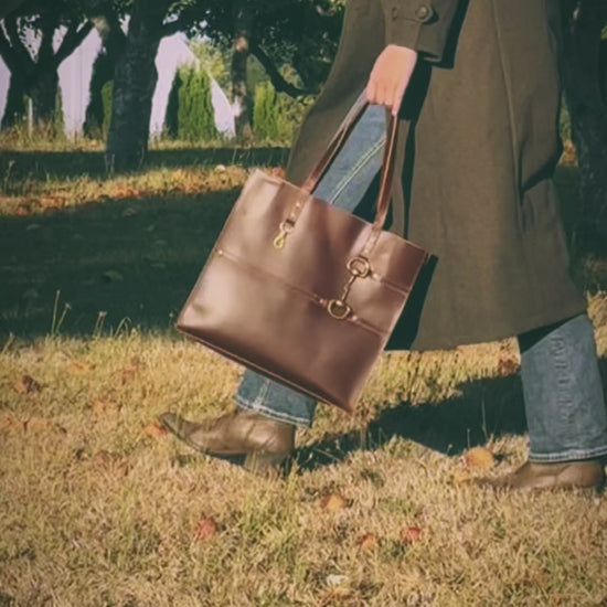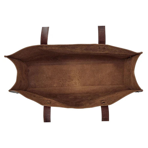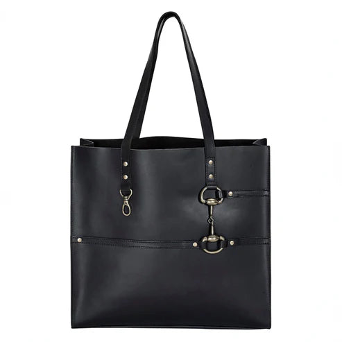 Crafted from rustic leather, the AWST Int'l Snaffle Bit Leather Tote Bag combines timeless equestrian style with practical design. Its classic snaffle bit detail adds subtle sophistication, while flat shoulder straps ensure comfortable wear. The open-top design features inside and outside slip pockets for easy access to essentials like keys, complemented by a spacious interior to accommodate daily necessities. Measuring 14"H x 15"W x 4.5"D with 22" shoulder straps, this tote balances style and functionality for everyday use.