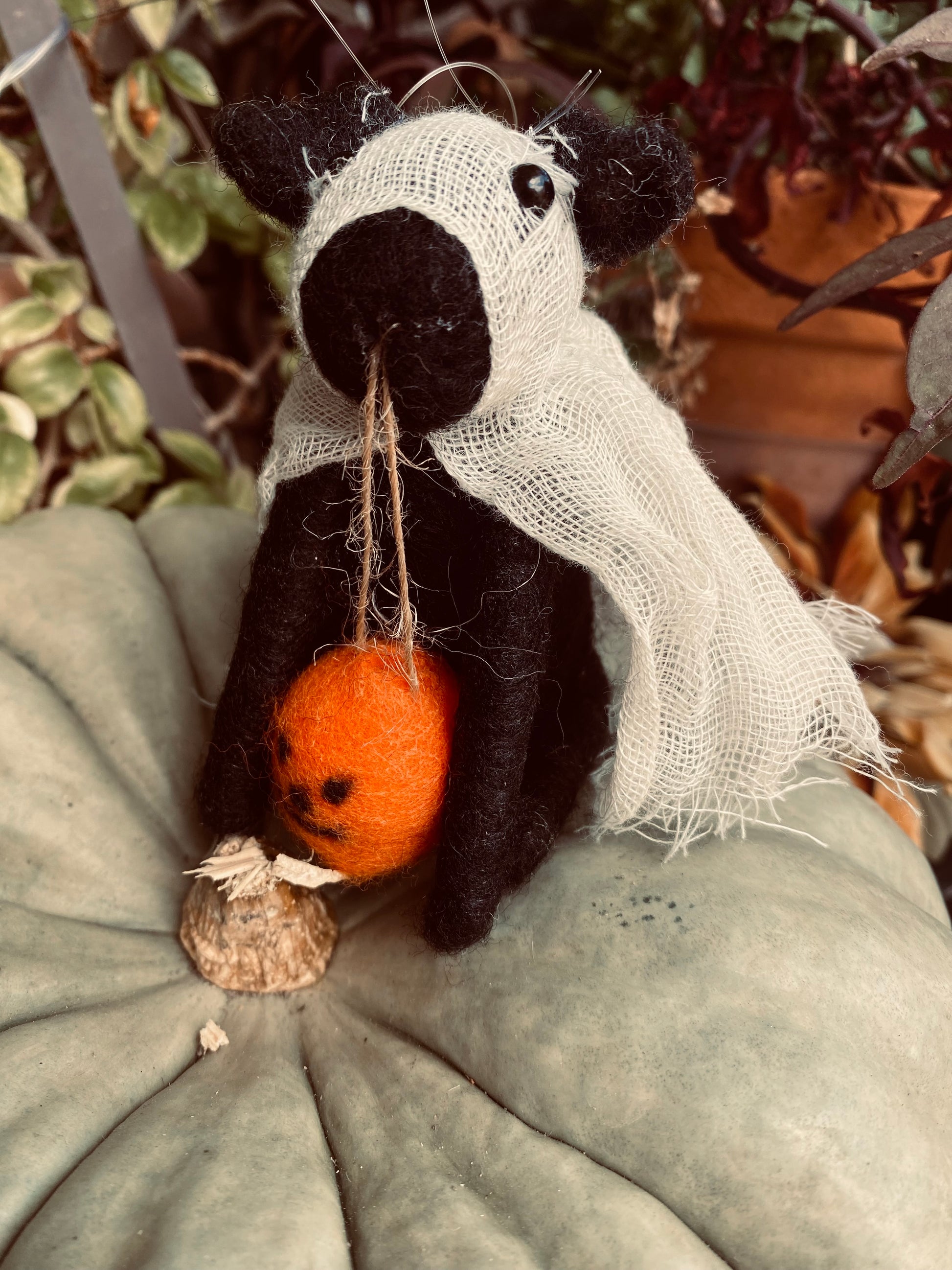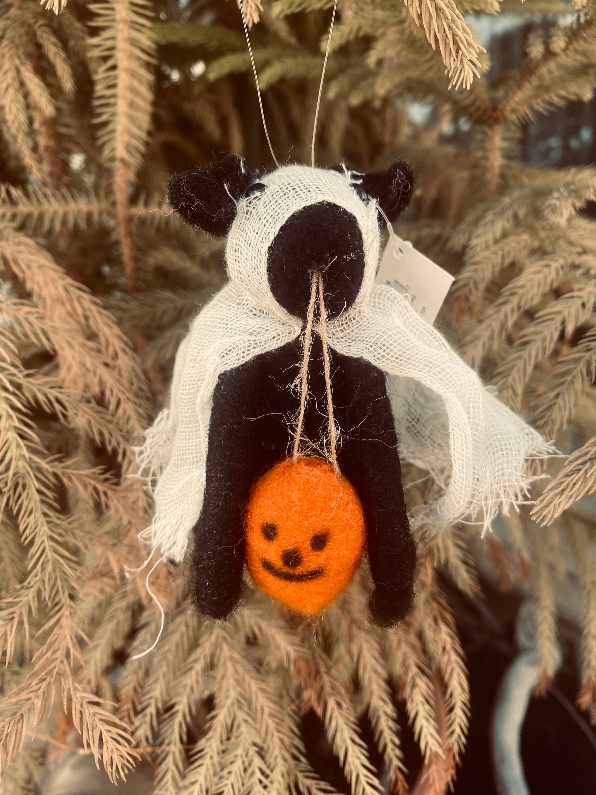 A felt critter from our Halloween Collection features a dog dressed as a ghost holding a jack-o-lantern in its mouth. Our Ghost Dog critter easily hangs via attached loop and makes a great addition to any Halloween décor. This is not a toy.