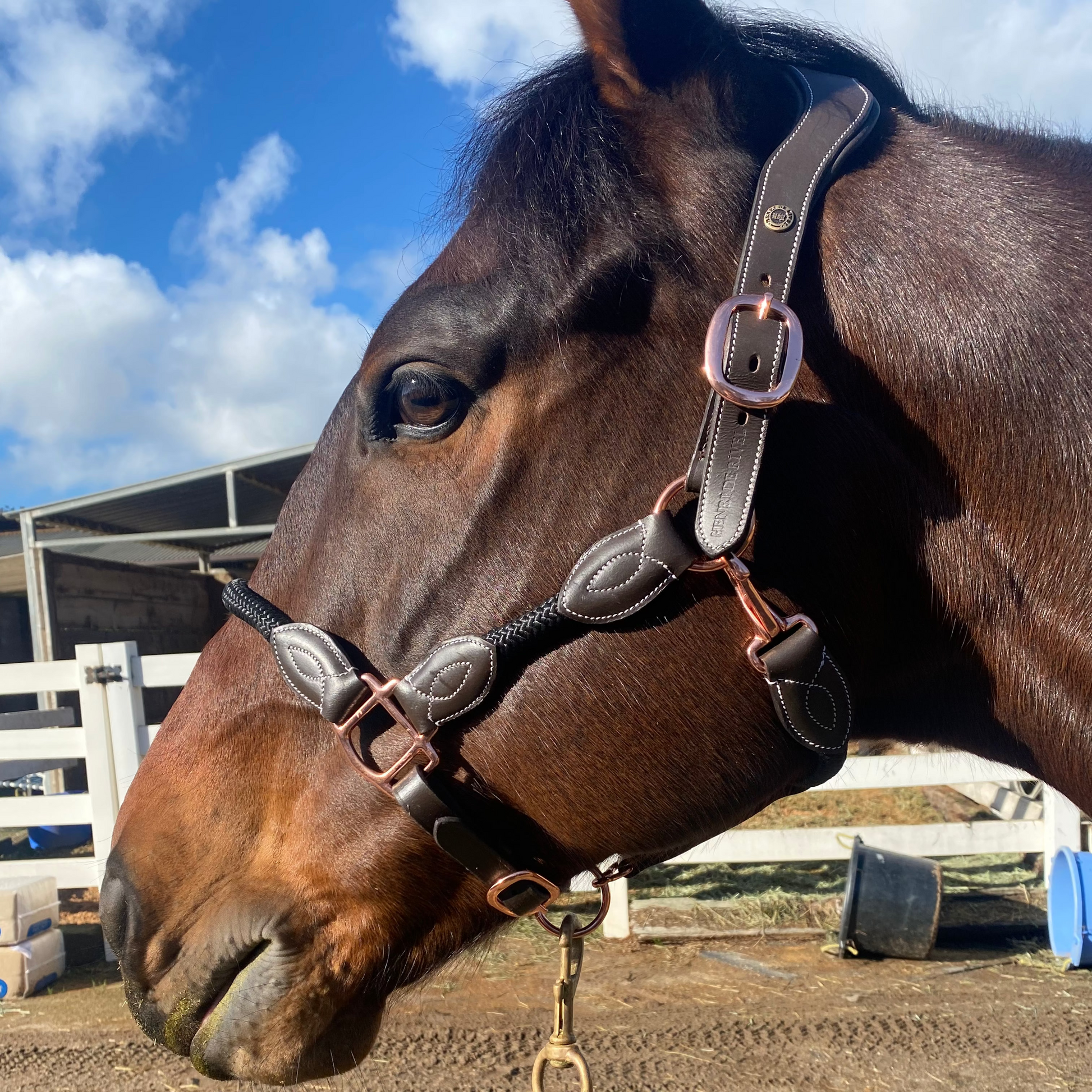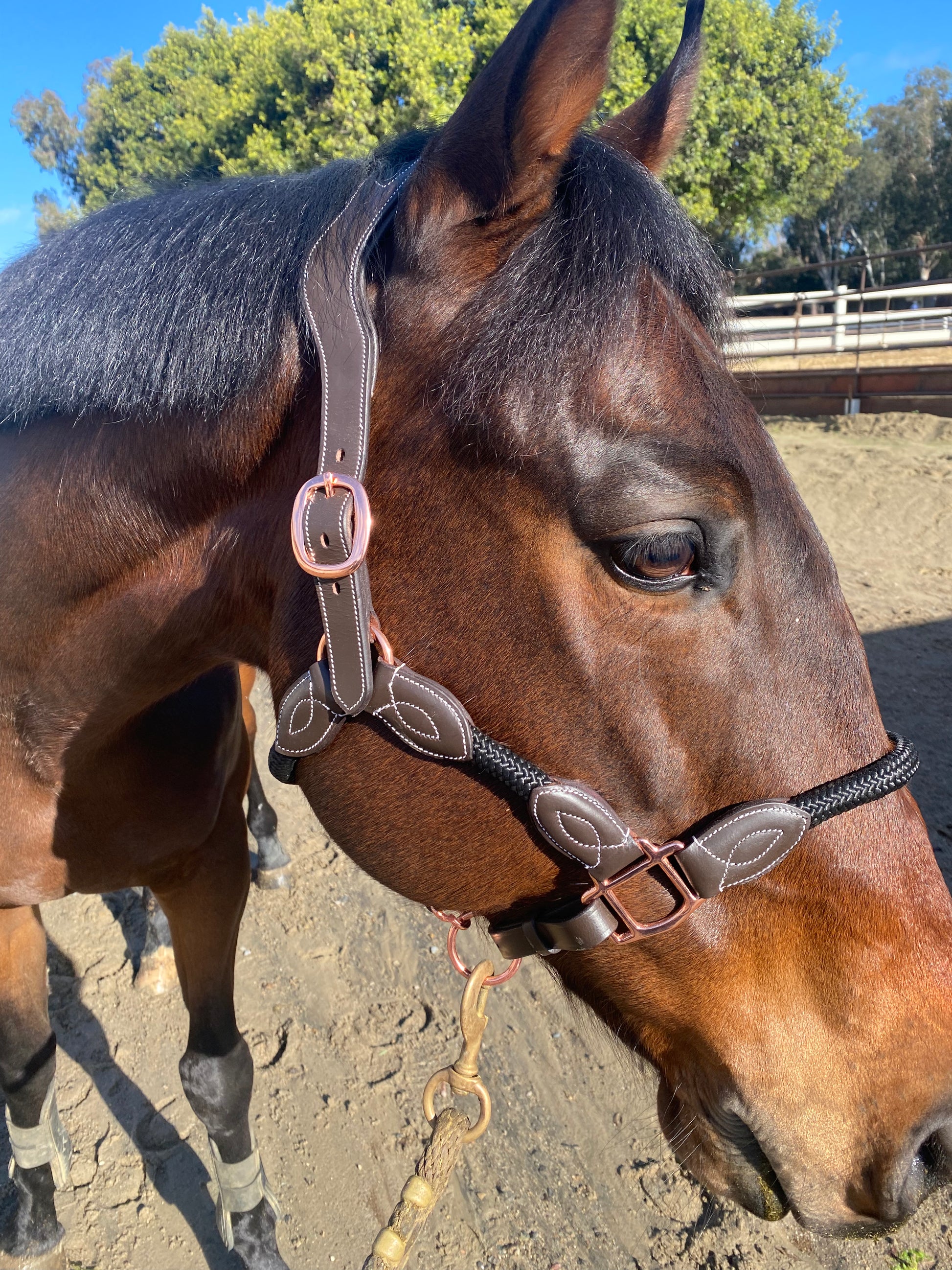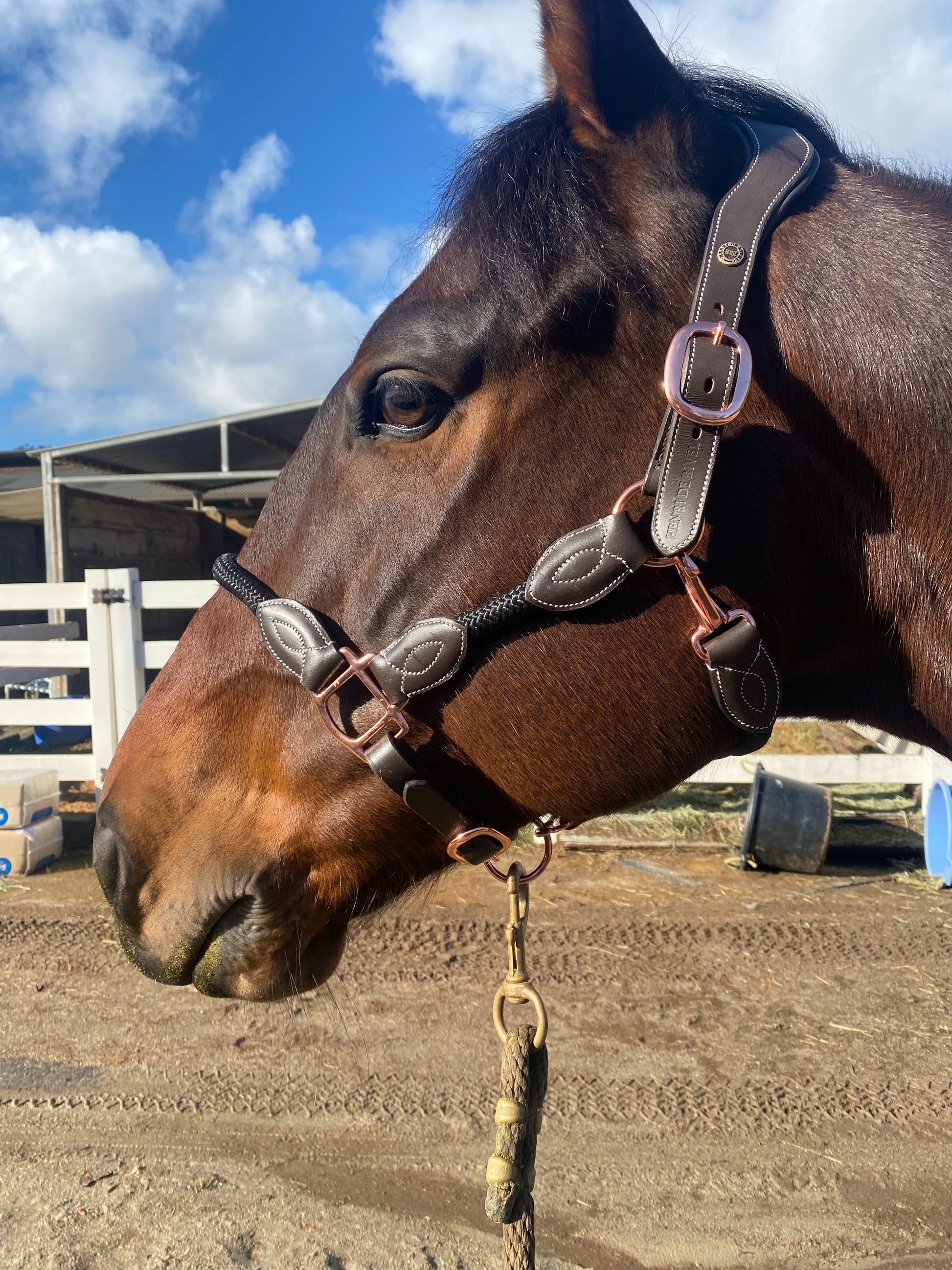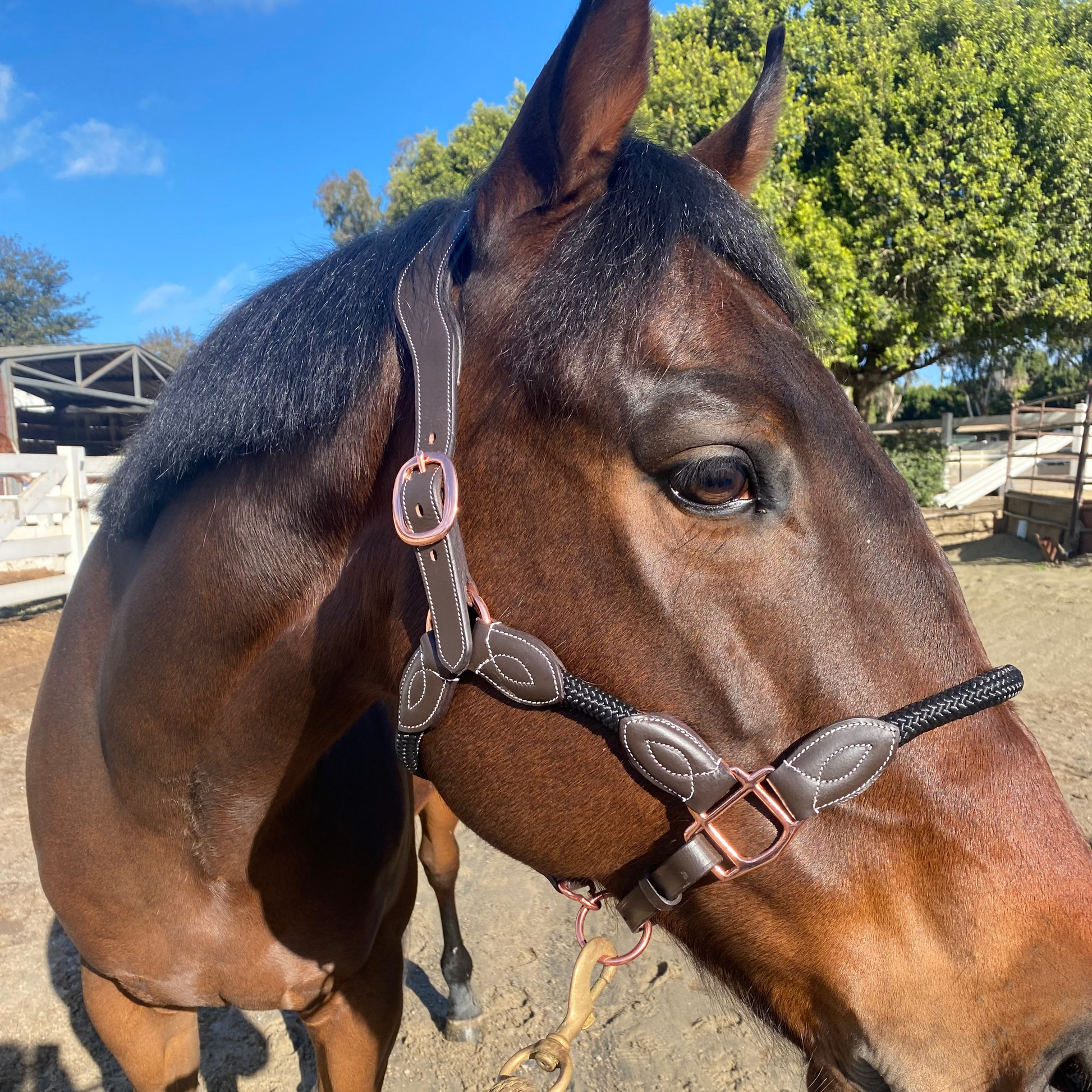 This unique fusion of flexible rope and quality leather make for a unique head-collar for your horse. The Henri de Rivel Leather Rope Halter features rose gold hardware for an elegant color combination. Fancy stitching on the leather give a hint of tradition while an ergonomic crown piece ensures your horse's comfort with pressure displacement and complete freedom of movement for the ears. A snap allows for easy on/off and safety.
