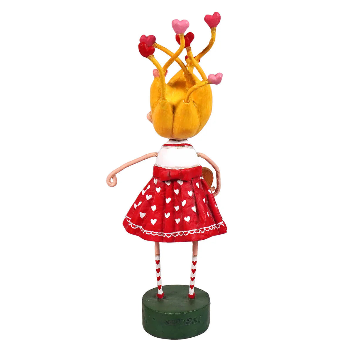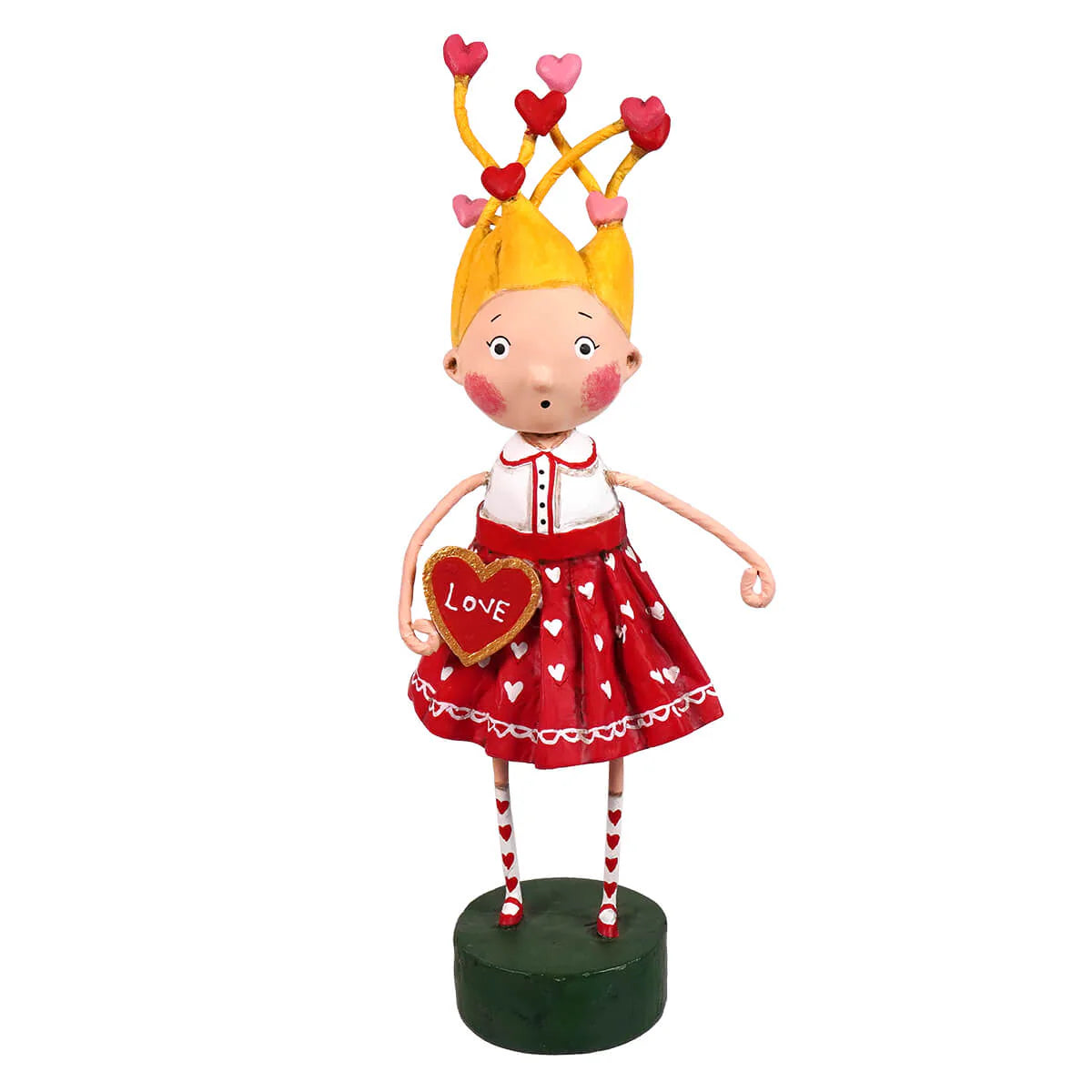 Tangled In Love is a joyful burst of color, charm, and heartfelt whimsy. This sweet Lori Mitchell character features playful blonde hair sprouting tiny heart-tipped curls, rosy cheeks, and a wide-eyed expression that feels full of wonder. She wears a classic red dress scattered with white hearts, striped stockings, and dainty red shoes, all finished with Lori Mitchell’s signature folk art detailing.