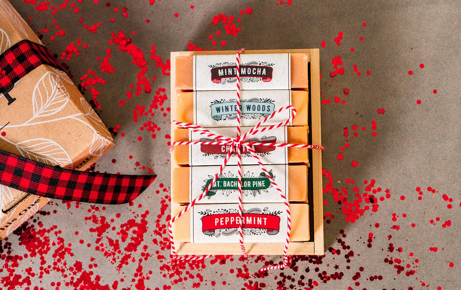 The holiday bundle comes in a handmade wooden soap tray, wrapped in a red and white twine bow and includes the following all-natural scents: