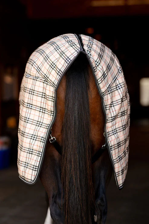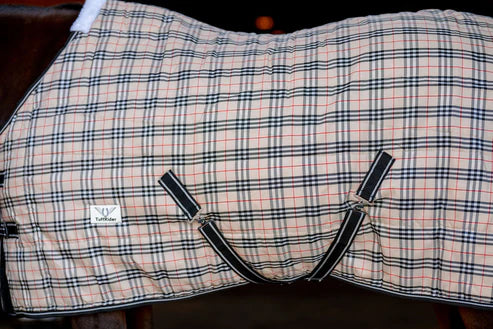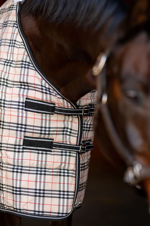 Tuffrider’s new and very fashionable Medium Weight Stable Blanket in a beige and black plaid, features a design that your horse will love as well as having total freedom and comfort in the stall. Styled with the standard neck, it boasts a durable 1200denier ripstop polyester outer (not waterproof), a cozy lining and 200 grams fiberfill to provide superior heat retention.